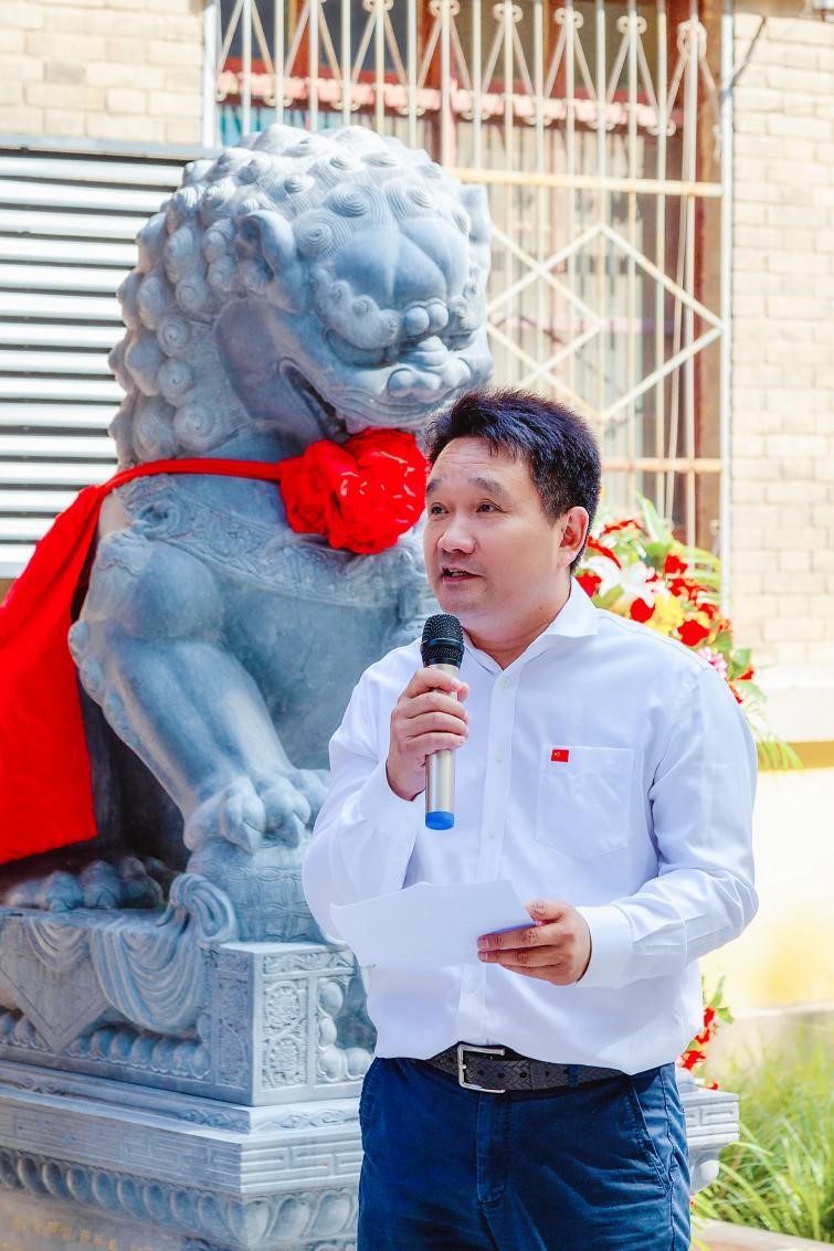 仪式上,谭贞、蒋威、张颜智、洪浩共同为石狮雕塑揭幕。